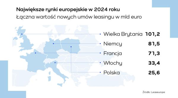 Polska zajmuje 5. miejsce w Europie pod względem wartości rynku leasingu. Wyprzedzają nas Wielka Brytania, Niemcy, Francja i Włochy. Leasing jest w Polsce jednym z najważniejszych narzędzi inwestycyjnych.